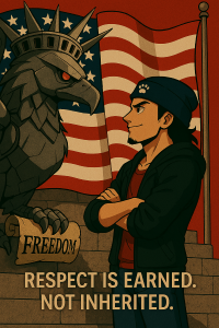�Liberty Standoff� Mayne Doggz face-to-face with a towering robotic eagle, talons gripping the scroll of Freedom, all under the rippling stars and stripes. That quote��Respect is earned. Not inherited.��hits like a war drum. |